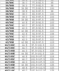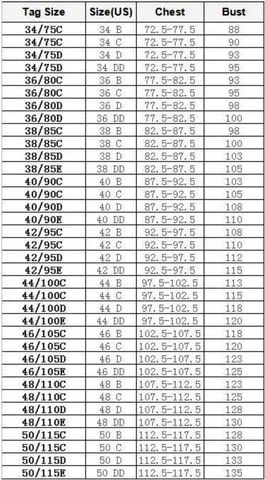Rozmiar obwodu, rozmiar miseczki: 34A, 34B, 34C, 34D, 34E, 36A, 36B, 36C, 36D, 36E, 38B, 38C, 38D, 38E, 40C, 40D, 40E , 42C, 42D, 42E, 44C, 44D, 44E, 46D, 46E